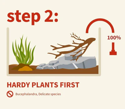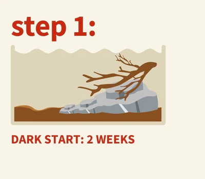 Dark Start completed? Perform 100% water change and add hardy plants. Begin water fertilization: Dose APT liquid fertilisers from Day 1 after planting. Avoid Bucephalandra, delicate plants until 2 weeks later.