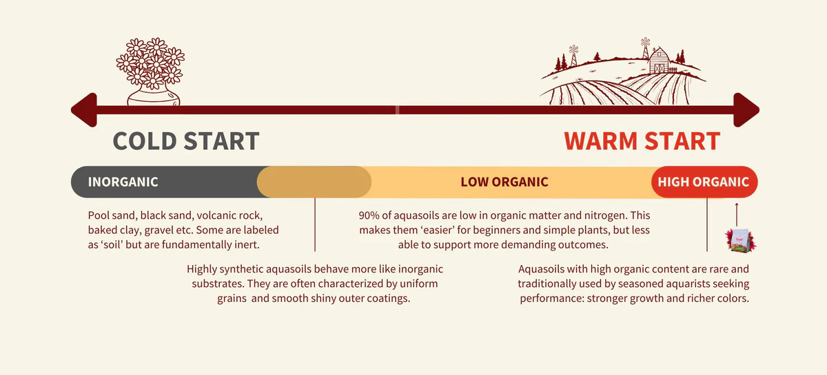 A Warm Start (using a highly organic substrate) is like starting a miniature farm: real work is required at the start to avoid making an immediate mess. A 2 week Dark Start (ideally at ~26C+/ 79F+), followed by a 100% water change before adding hardy plants (no Bucephalandra, rare hybrids, delicate plants yet). Weekly 80% water change for another 2 weeks. Fish and delicate plants enter 1 month after planting. The reward? Richer colors and stronger growth that endures, with enhanced microbial diversity that supports crystal clear waters.