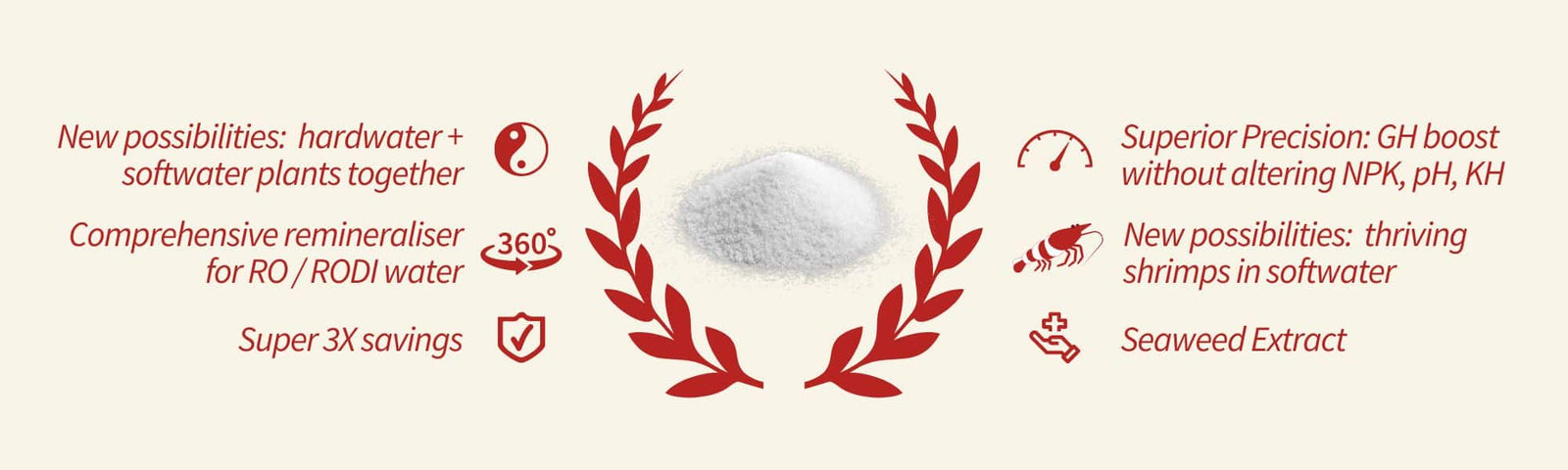 Replenishes all vital minerals in RO/ RODI water without negatively altering NPK. Moderately raises KH to ~2 dKH and pH to 7.2~7.6