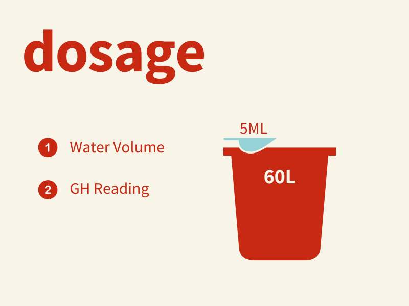 Each 3.5g / 5ml per 60L adds 9ppm Ca and 2.5ppm Mg (+1.8dGH, +0.5 dKH)