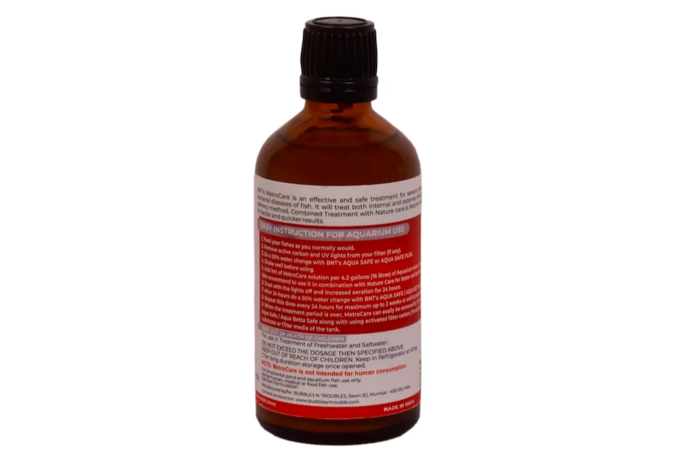 Add 1ml of MetroCare solution per 4.3 gallons (16 liters) of Aquarium water into your tank. (We recommend to use it in combination with Nature Care for faster and better results)