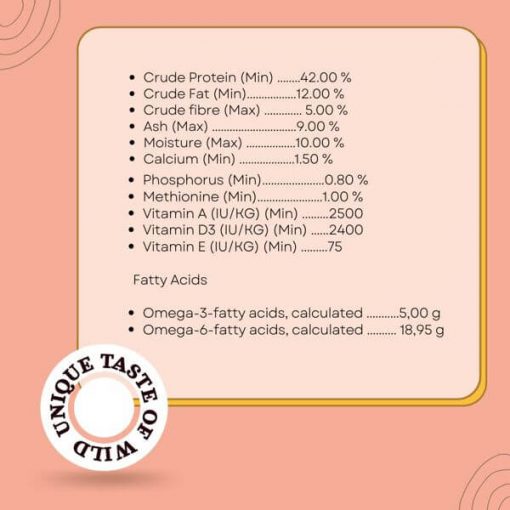 Black Soldier Fly Larvae (BSFL), Tuna & Krill Meal, fish Protein concentrate, Green Peas, Potato, Wheat, dicalcium phosphate, calcium carbonate, DL-Methionine, Lecithin, Choline Chloride, L-Lysine, vitamin E supplement, Biotin, Niacin, Calcium L-Ascorbyl-2-Monophosphate, marigold extract, Zinc Oxide, Manganous Oxide, D-Calcium Pantothenate, Vitamin B12 supplement, Beta-Carotene, Rosemary extract, riboflavin, Copper Sulfate, Pyridoxine hydrochloride, Thiamine Mononitrate, Inositol, Folic Acid, Vitamin A supplement, Calcium Iodate, Sodium Selenite, Vitamin D3 supplement.