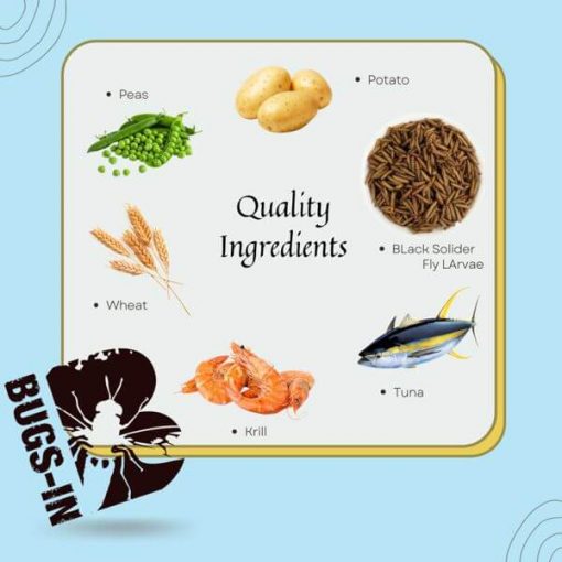 Black Soldier Fly Larvae (BSFL), Tuna & Krill Meal, fish Protein concentrate, Green Peas, Potato, Wheat, dicalcium phosphate, calcium carbonate, DL-Methionine, Lecithin, Choline Chloride, L-Lysine, vitamin E supplement, Biotin, Niacin, Calcium L-Ascorbyl-2-Monophosphate, marigold extract, Zinc Oxide, Manganous Oxide, D-Calcium Pantothenate, Vitamin B12 supplement, Beta-Carotene, Rosemary extract, riboflavin, Copper Sulfate, Pyridoxine hydrochloride, Thiamine Mononitrate, Inositol, Folic Acid, Vitamin A supplement, Calcium Iodate, Sodium Selenite, Vitamin D3 supplement.