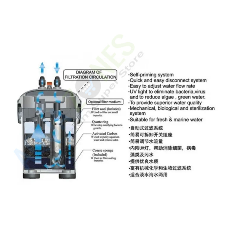 It is a powerful external canister filter for medium tanks, plant tank, shrimp aquarium and marine aquarium.