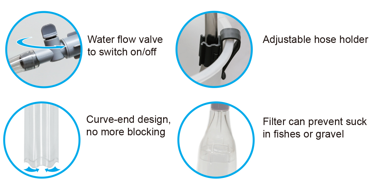 ●Repeatedly stick the cleaner into the gravel, debris will be automatically taken out. Please adjust the “water flow adjustment valve” to low volume if the gravel or substrate is sucked out.