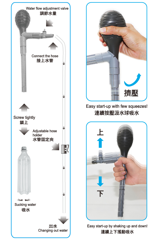 ●To start changing water, simply squeeze the “pressingstart-up pump” or shake the cleaner up and down few times!