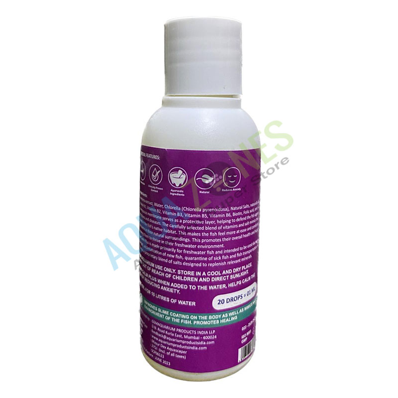 Improves slime coating on the body as well as mimics natural environment of the fish. Stress free & Calm fish. 100 % natural formula. Advanced Nano Technology.
