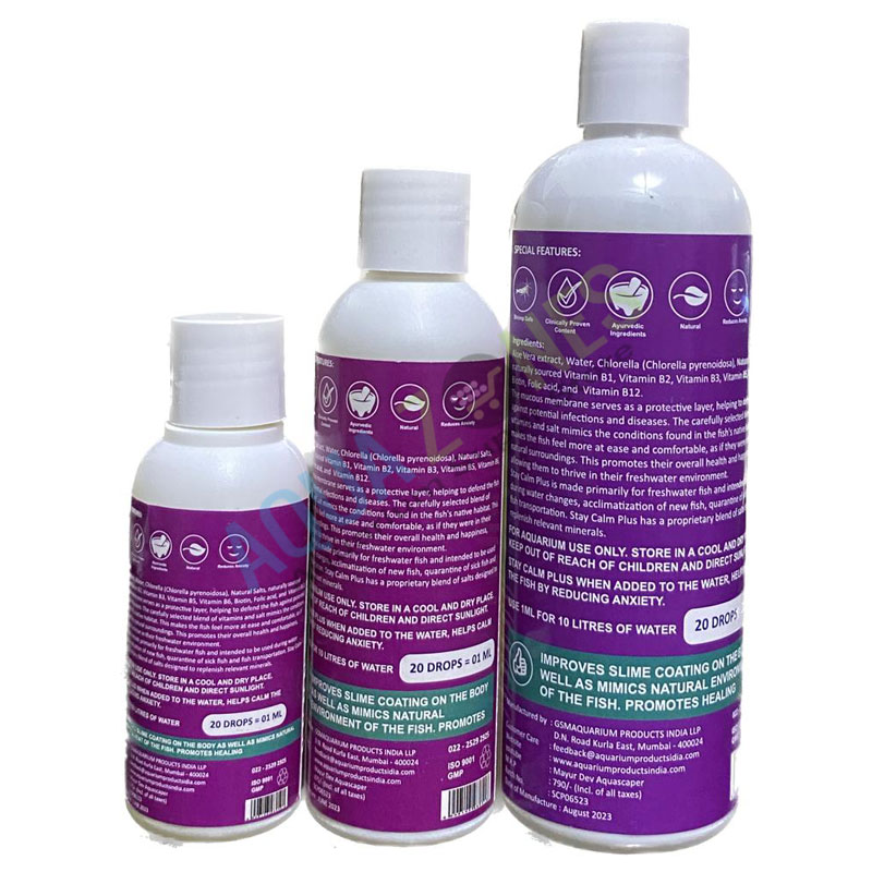 Is made primarily for freshwater fish and intended to be used during water changes, acclimatization of new fish, quarantine of sick fish and fish transportation. Stay Calm Plus has a proprietary blend of salts designed to replenish relevant minerals.