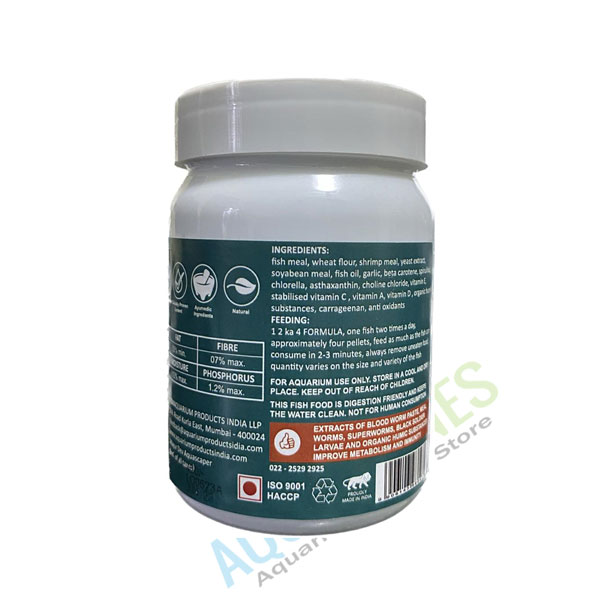 Fish Meal, Wheat Flour, Shrimp Meal, Yeast Extract, Blood Worm Paste, Insect Protein, Soyabean Meal,Fish Oil,Garlic,Beta Carotene, Spirulina, Chlorella, Asthaxanthin,Choline Chloride, Vitamin E ,Stabilised Vitamin C , Vitamin a, Vitamin D , Organic Humic Substances, Carrageenan, Anti Oxidants