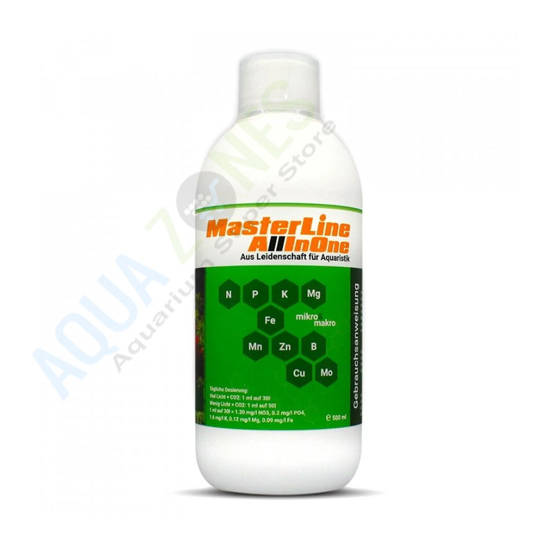 MasterLine All in One Golden is a special fertiliser whose combination of important micro- and macronutrients has been specially developed for difficult aquarium plants. This fertiliser is only suitable for tanks with an additional CO2 supply. The chemical form of the elements contained in the fertiliser can be easily absorbed by plants. This results in healthier root growth and the aquatic plants show in general a more robust growth. It is recommended to use MasterLine All ln One Golden together with MasterLine Carbo to supply the aquatic plants with all the necessary nutrients for healthy growth.
