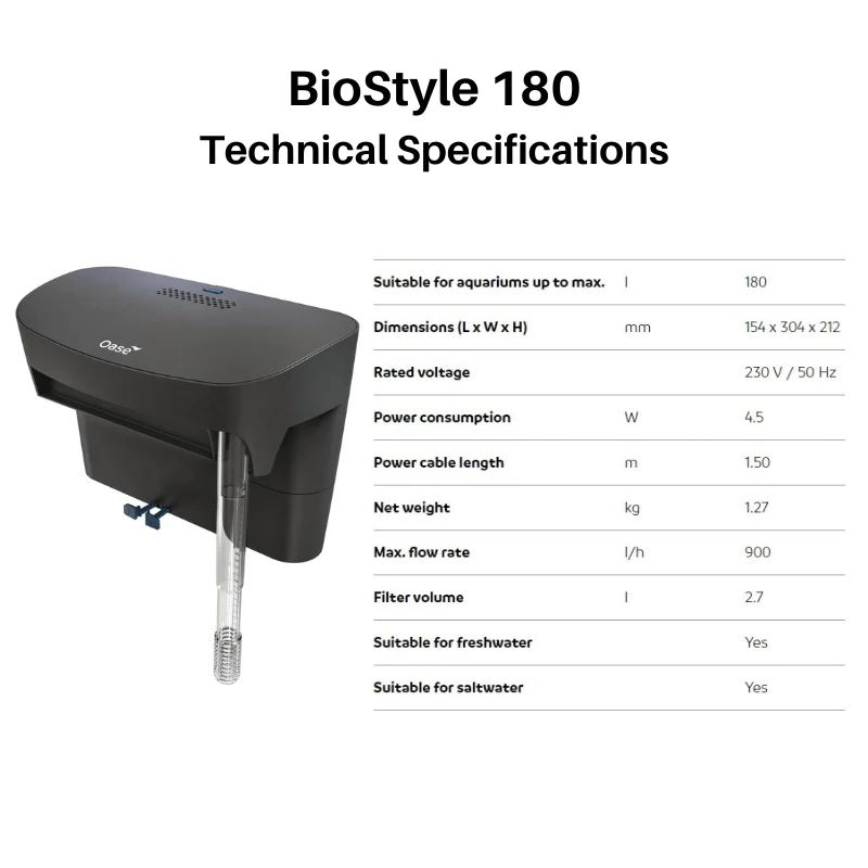 BioStyle 180 Suitable for aquariums up to max. l 180 Dimensions (L x W x H) mm 154 x 304 x 212 Rated voltage 230 V / 50 Hz Power consumption W 4.5 Power cable length m 1.50 Net weight kg 1.27 Max. flow rate l/h 900 Filter volume l 2.7 Suitable for freshwater Yes Suitable for saltwater Yes