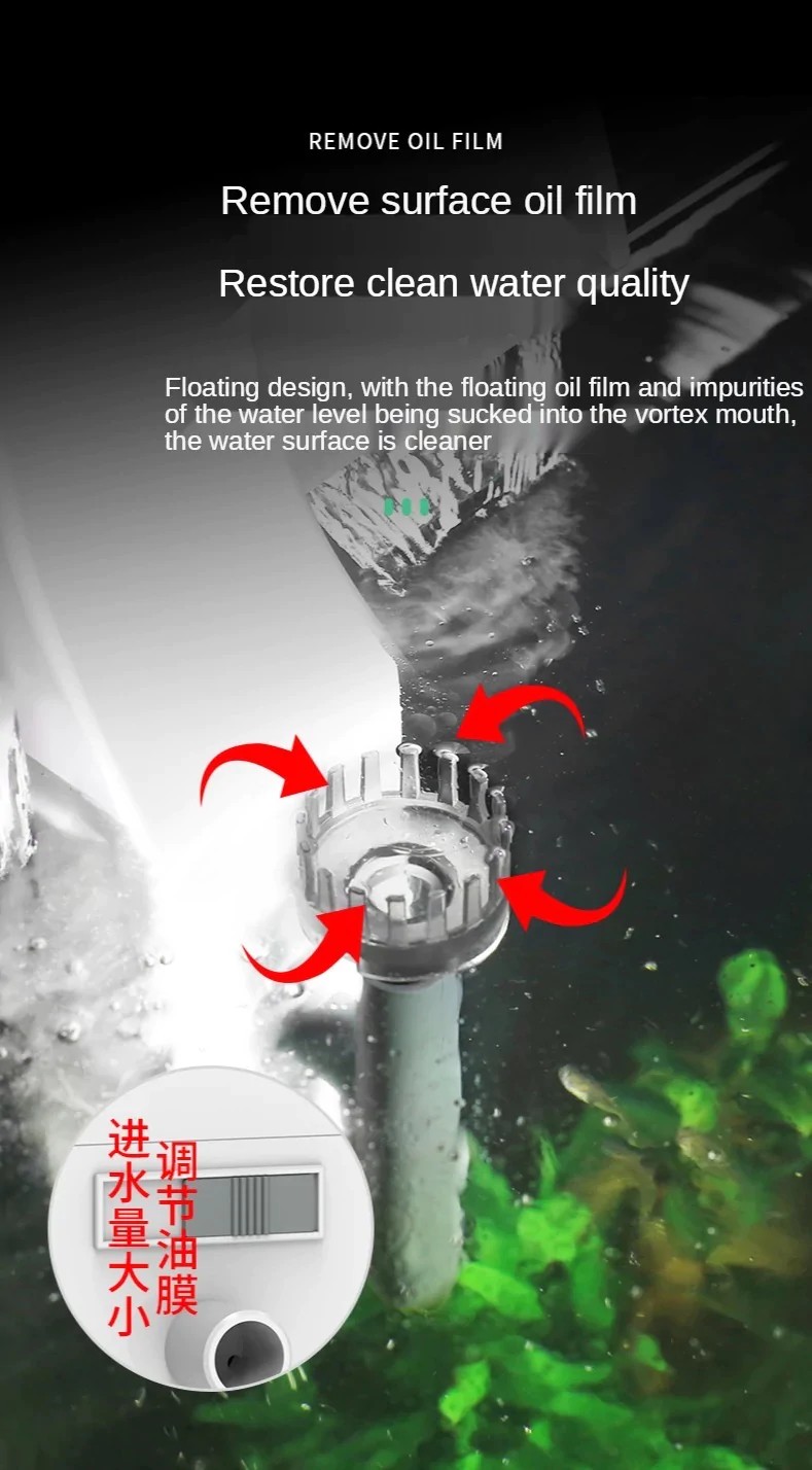 (2)Floating design, with the floating oil film and impurities of the water level being sucked into the vortex mouth, the water surface is cleaner.Waterfall-type widened water outlet platform, large flow, smooth water, oxygen fully dissolved water, improve dissolved oxygen.Oil film adjustment switch to adjust the amount of water intake.